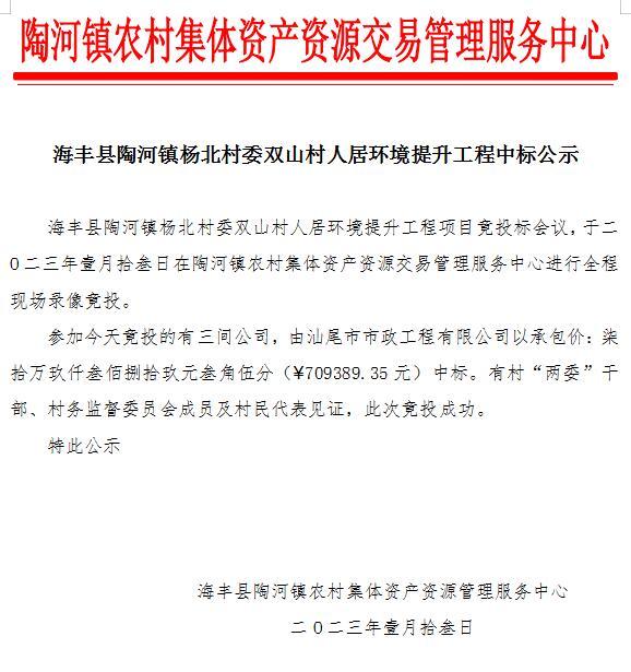 海丰县陶河镇杨北村委双山村人居环境提升工程中标公示